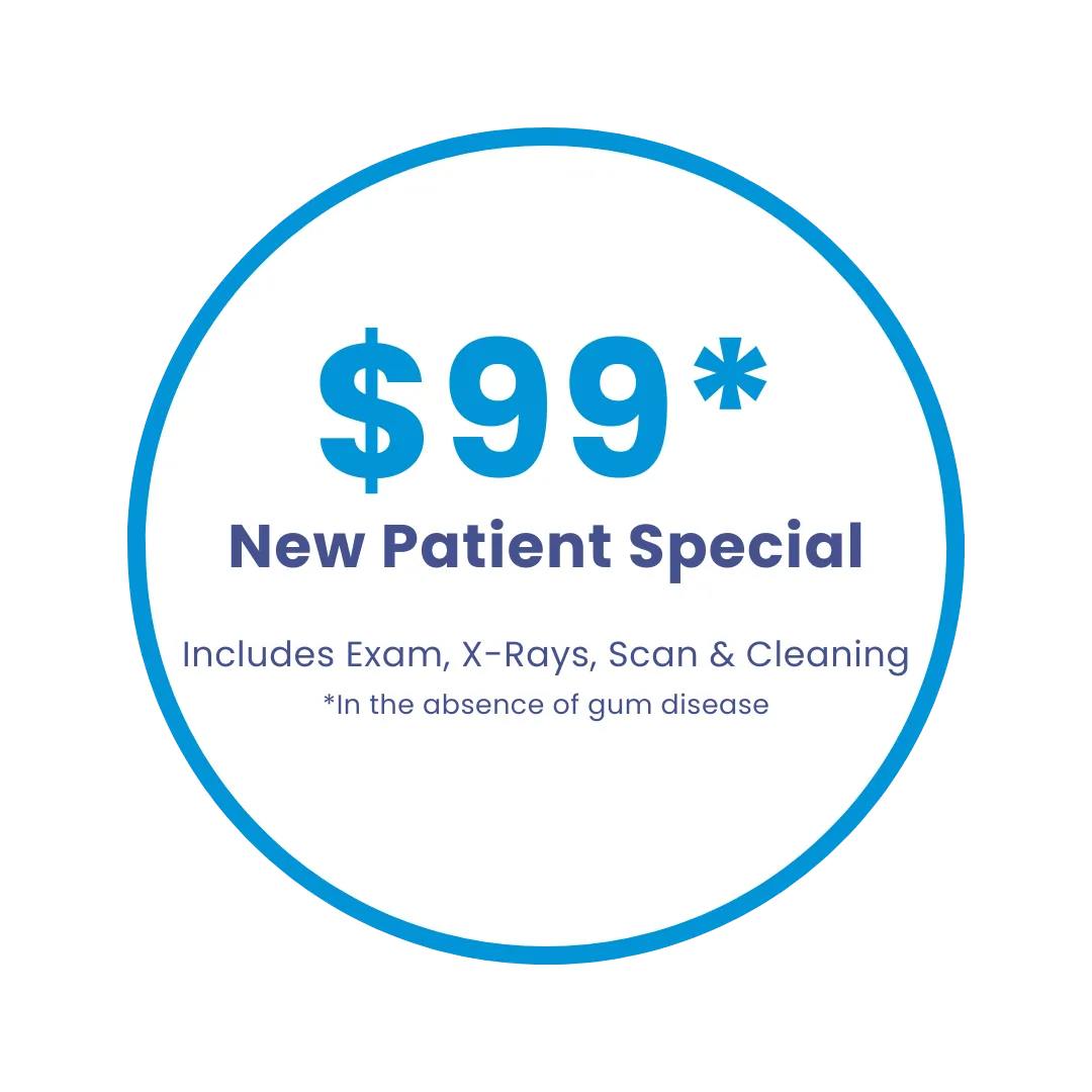 Our $99 new patient special includes an initial exam and cleaning. Please note that insurance may cover some or all of the cost, depending on your plan. Contact our office to confirm details.